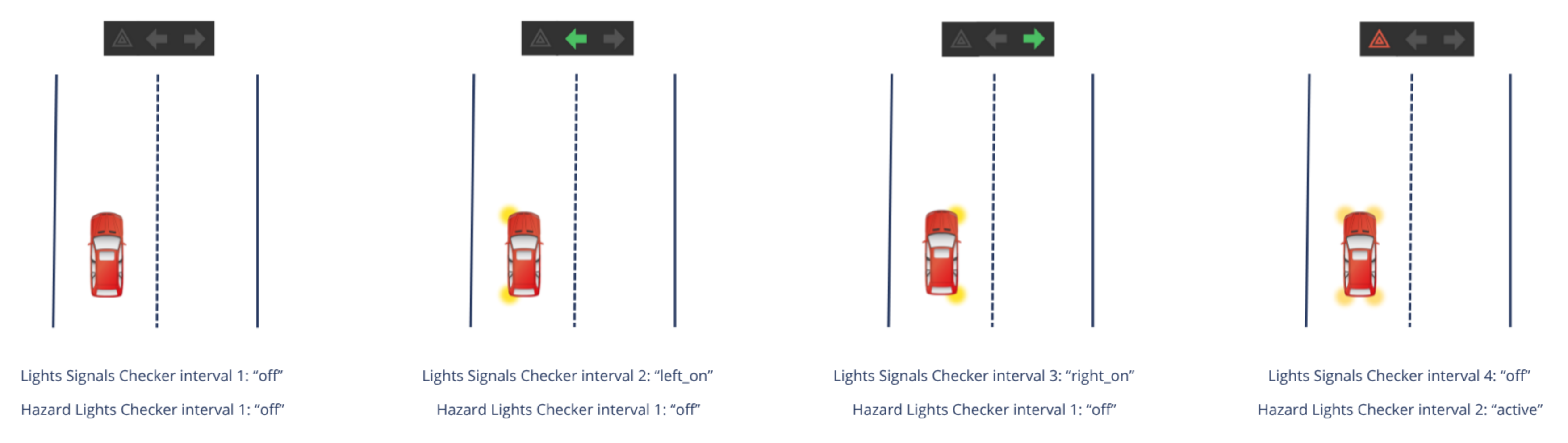 A new interval is triggered each time a monitored signal enters one of the configured signal_states and continues until the signal transitions to another state. The lights_signals_checker and hazard_lights_checker use the vehicle.state.vehicle_indicators struct to retrieve information on the vehicle's sensors. The additional_properties_checker should use the vehicle.state.additional_properties list, so the signal_name parameter must match one of the items in this list.