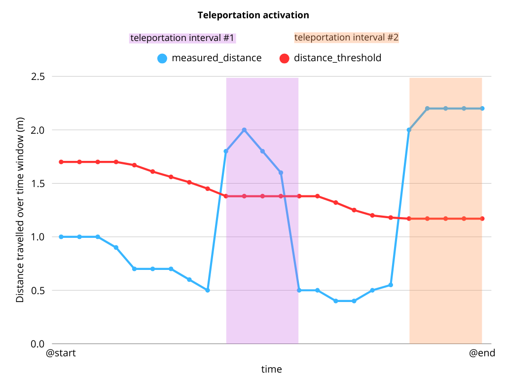 The following diagram illustrates how the Teleportation checker is triggered when the object's traveled distance exceeds its expected threshold, i.e., the object travels farther than expected. The interval ends only when the distance falls below the threshold.