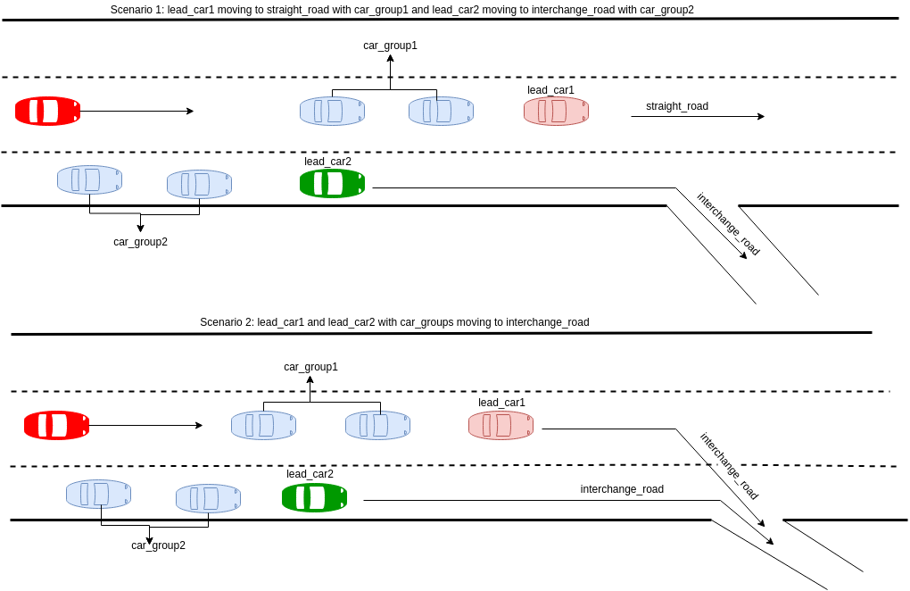 lead_vehicle_2 & lead_vehicle_group_2: lead_vehicle_2 and lead_vehicle_group_2 start in the outermost lane ahead of the Ego. They proceed to take one path through the interchange.