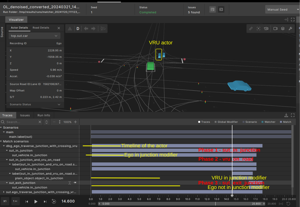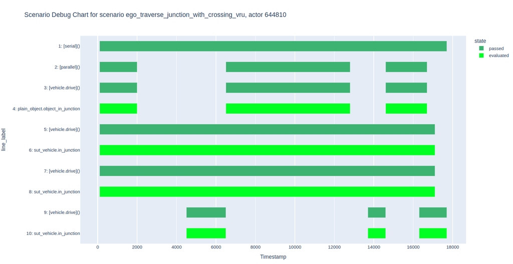 The bars in the chart represent scenarios and modifier invocations in the OSC scenario definition. Below is the interpretation of the chart for the scenario ego_traverse_junction_with_crossing_vru: