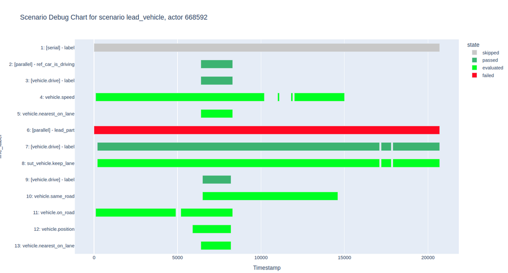 min_lead_part_phase_durationparameter. In this run, the parameter is set to 2 seconds, but the duration of the actor's drive (line 9) is only 1.7 seconds, causing the failure. - As a result, the top-level serial (line 1, grey) is skipped due to the failure of its child phase.