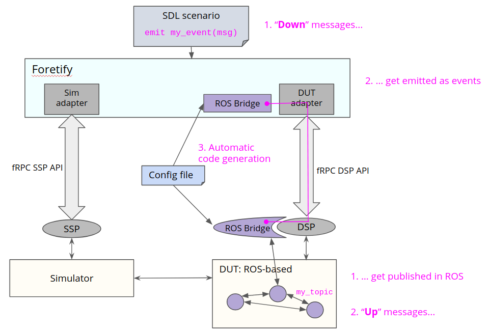 The Foretify Message Bridge builds a Foretify-System bridge, where "System" is a publish-subscribe system such as ROS, ROS2 or DDS. You can use the Bridge to send messages "down" from Foretify to the SUT and "up" from the SUT to Foretify.