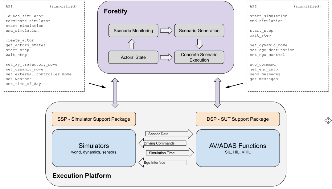 Figure 2 presents the Foretify execution platform architecture and shows how it interacts with a simulator and SUT. It also depicts the support packages and their basic RPC API.