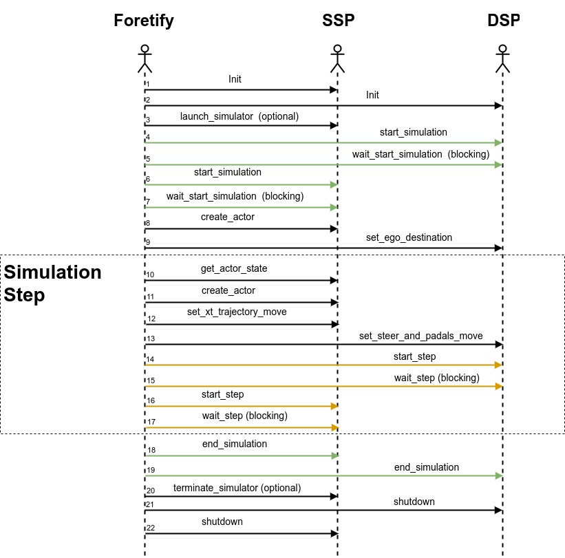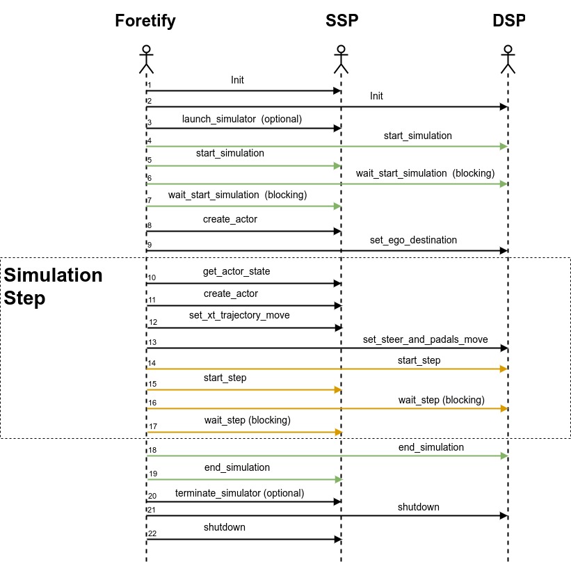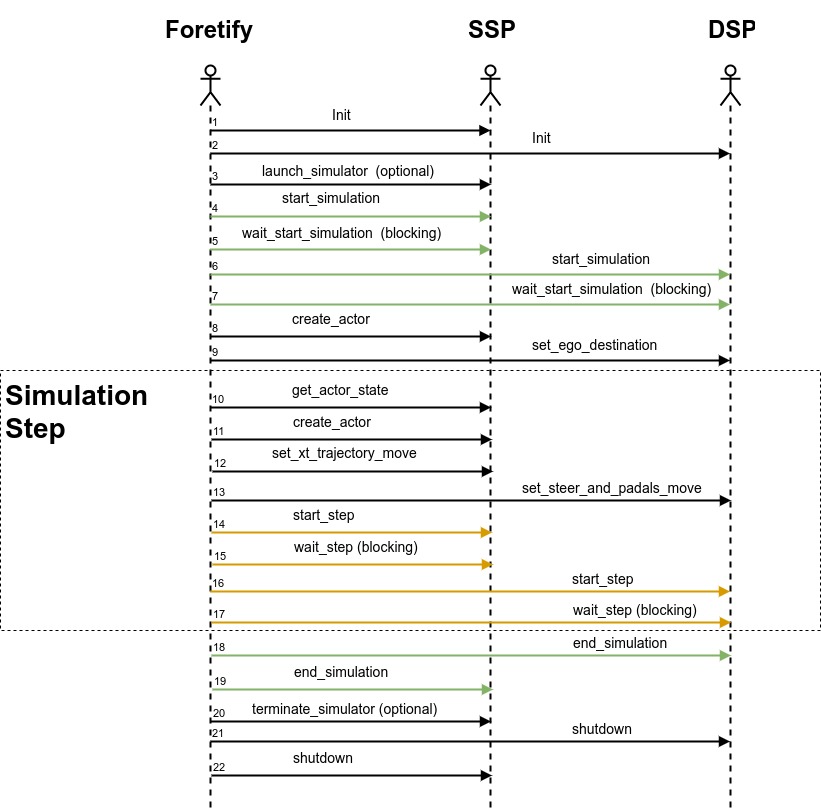 Foretify communicates with the SSP and DSP via fRPC in a client-server mode. The SSP and DSP act as the server and Foretify as the client. This means that Foretify calls both the DSP and the SSP at the start of simulation and also at the start of every simulation step.