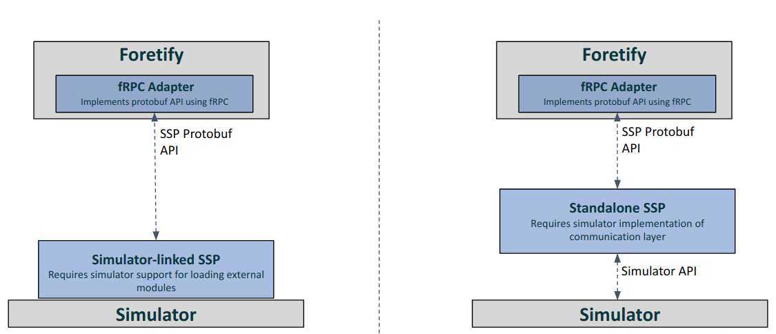 - Standalone SSP - The SSP is executed as a third process, in addition to Foretify and the simulator. The SSP opens two communication channels, one for communicating with Foretify using fRPC and the other to communicate with the simulator using the library it provides. Foretify executes the SSP process at the start of each test, and closes it at the end of the test.