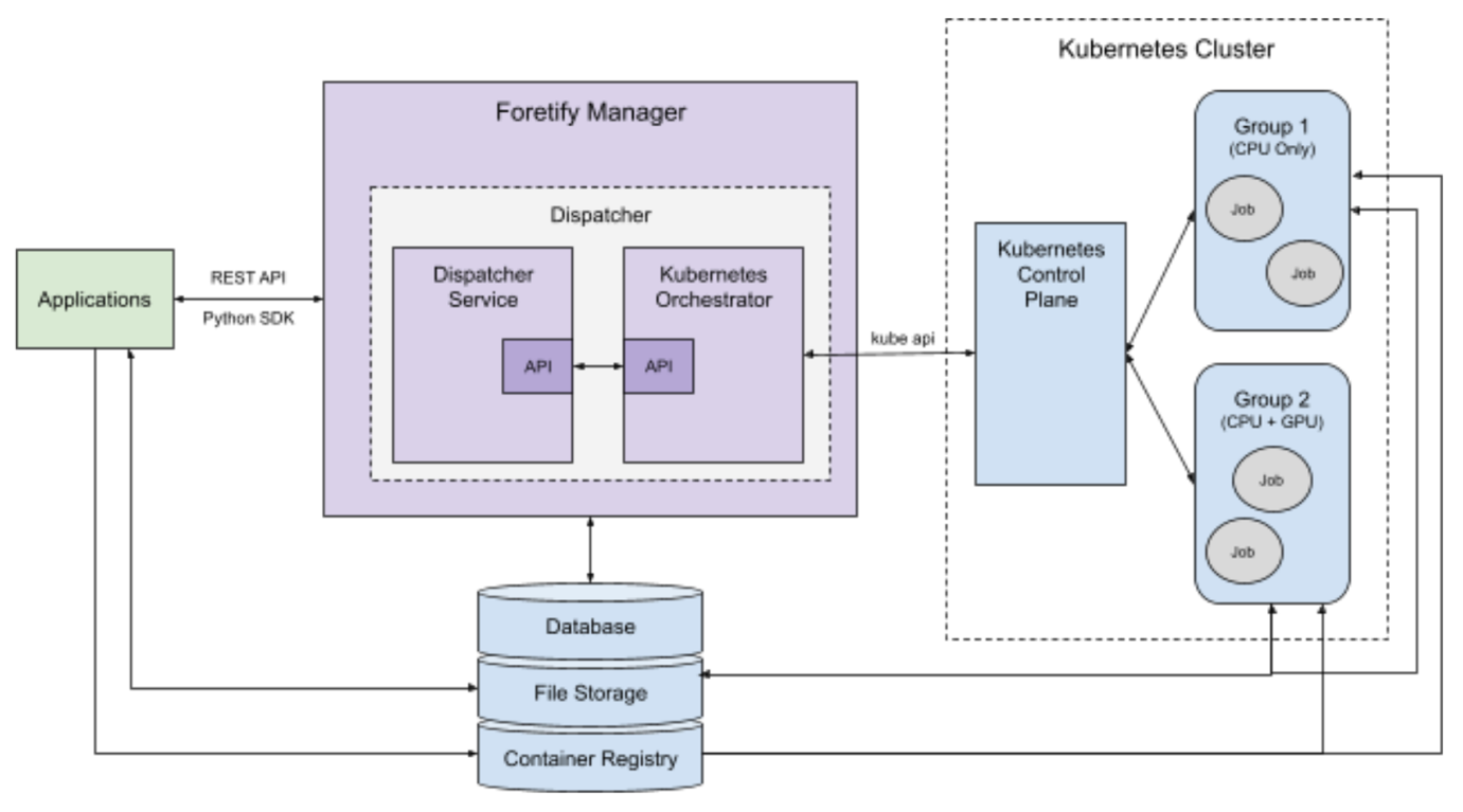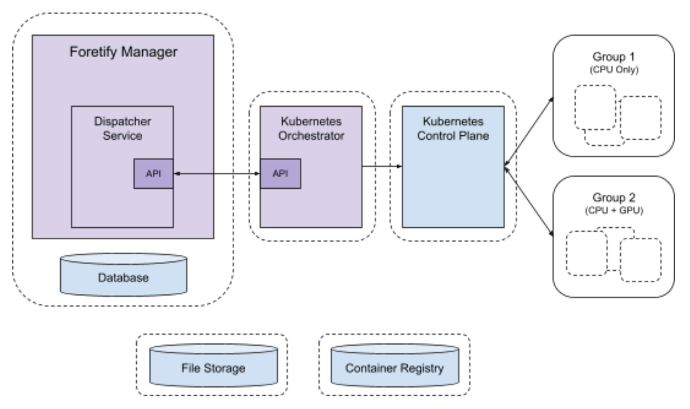 The Dispatcher is a service that runs as a module within Foretify Manager. Users interact with the dispatcher using Foretify Manager’s API. The Dispatcher interfaces with orchestration services via gRPC/HTTP2.
