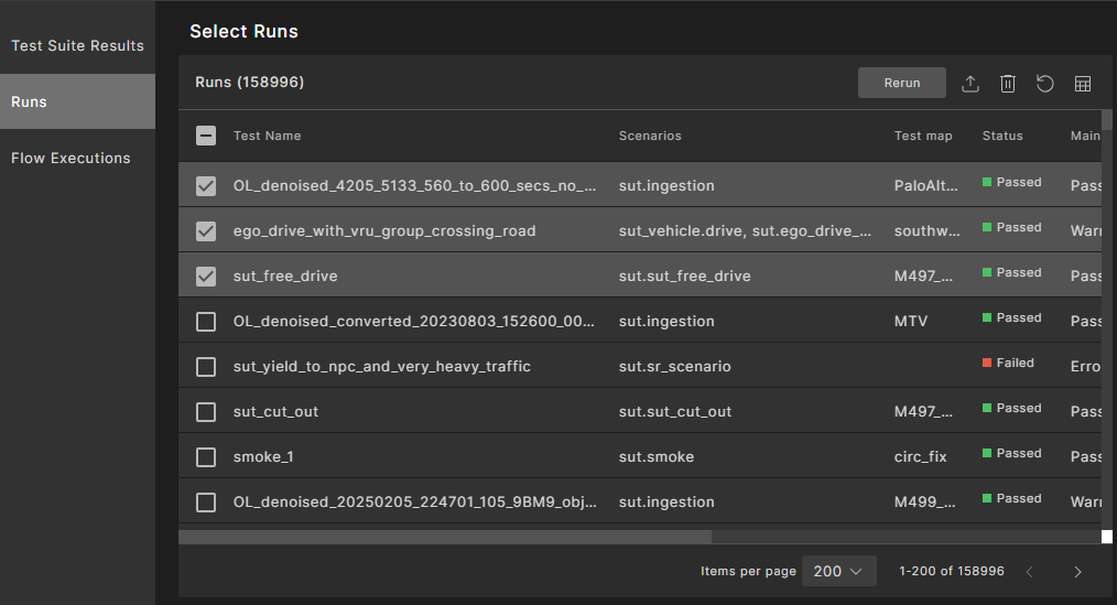 In the Test Suite Results tab, select the required test suites and click Rerun. The associated runs for the selected test suites are displayed. To learn how to analyze these runs, see Triaging test suite results.