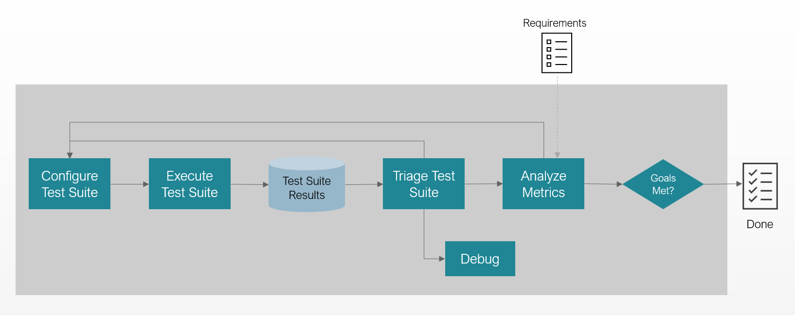 With Foretify Manager, you configure and execute your test suite. Next you triage and debug the issues that need to be addressed. You can then analyze the metrics for your test suite, compare them to your requirements, and iterate through the workflow as necessary.
