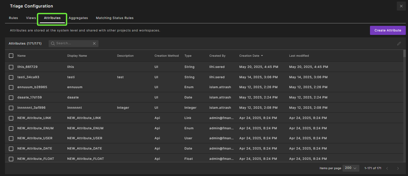 To create a new attribute, click Create Attribute on the top right. See Create a triage attribute for steps.