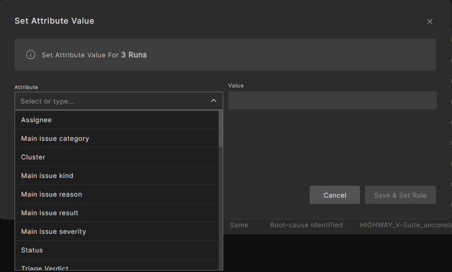 A triage attribute is metadata that is applied to a run as a key-value pair. Creating, manipulating, and defining attribute-based rules are key to an effective triage process. Attributes help in determining the active state of runs, organizing the data in a more accurate and efficient way, and ultimately reducing the time it takes to find the most important issues in a test suite result.