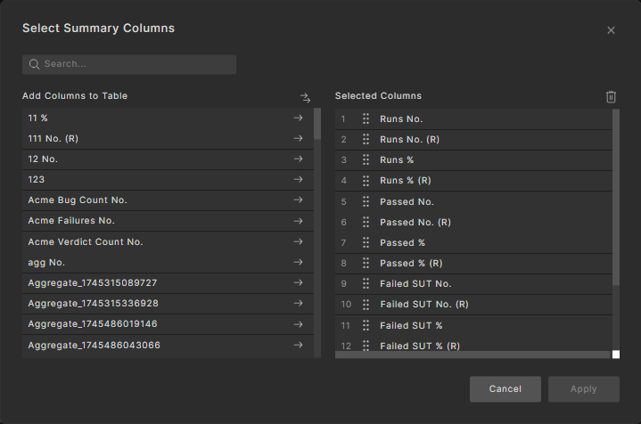 Click the right arrows to add columns to the table. You can also use search to locate columns.