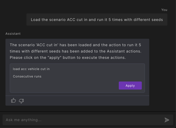 The Assistant enhances the application by automating specific tasks, such as loading scenarios and executing Foretify runs. When generating actions, the Assistant presents a list of these actions to the users, along with the option to "apply" them. This allows users to review and verify the actions before they are executed, providing an opportunity to ensure that everything is correct before changes affect the application state.