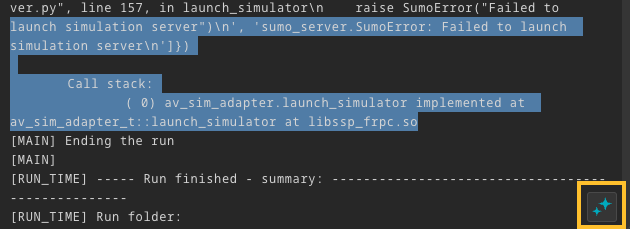 The Assistant enhances the analysis of runs by providing detailed answers to the user queries about issues encountered during the run. This capability enables users to identify and understand problems, facilitating faster debugging and refinement of their scenarios. For now, the Assistant is exposed to information such as the log, the source code, and the the main issue.
