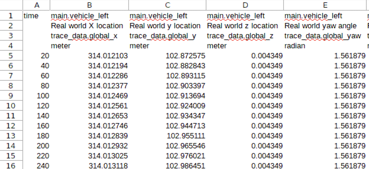 Below is a partial screen capture of a CSV file created by the predefined traces. This trace captures the changing values of the attributes of all vehicles in the active scenario. For more information on predefined traces, see trace.