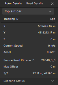 In the Actor Details, you can view the state of vehicle actuators (brake pedals, throttle pedals, and the steering wheel) if the Foretellix SUT Model driver is integrated. See the Foretellix Driver module for details.