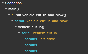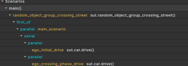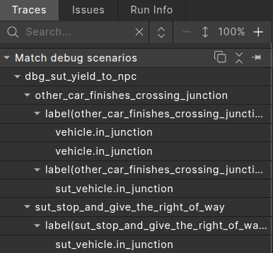 When debugging a run, the Scenarios tree shows match scenarios. These are scenarios that were detected within a real world recording processed by Evaluation scenarios.