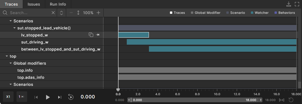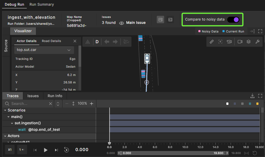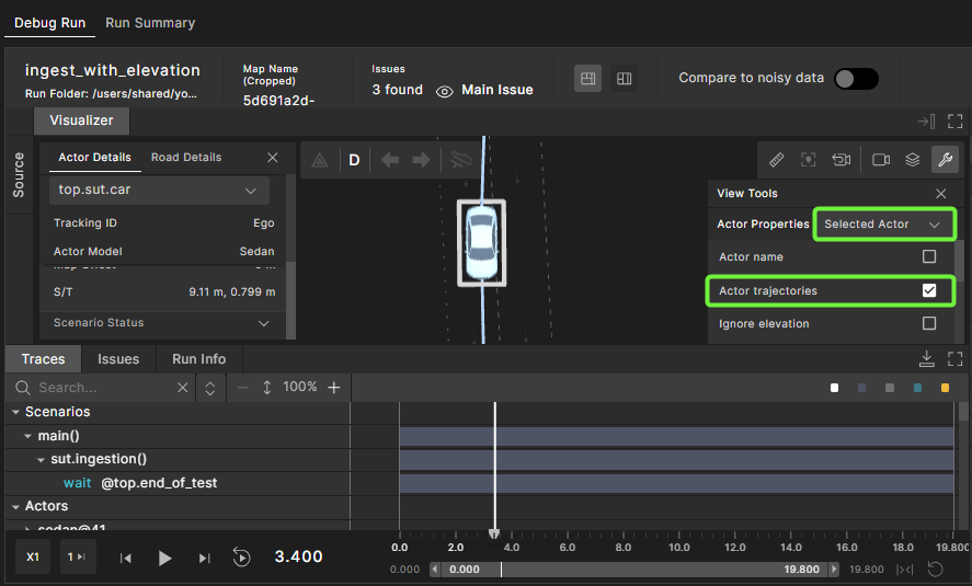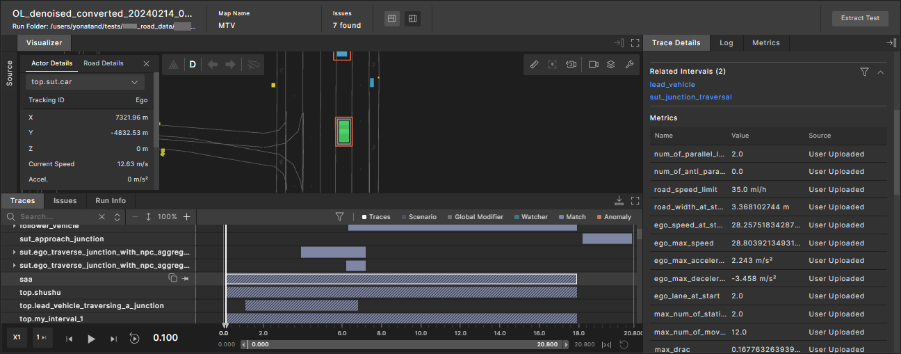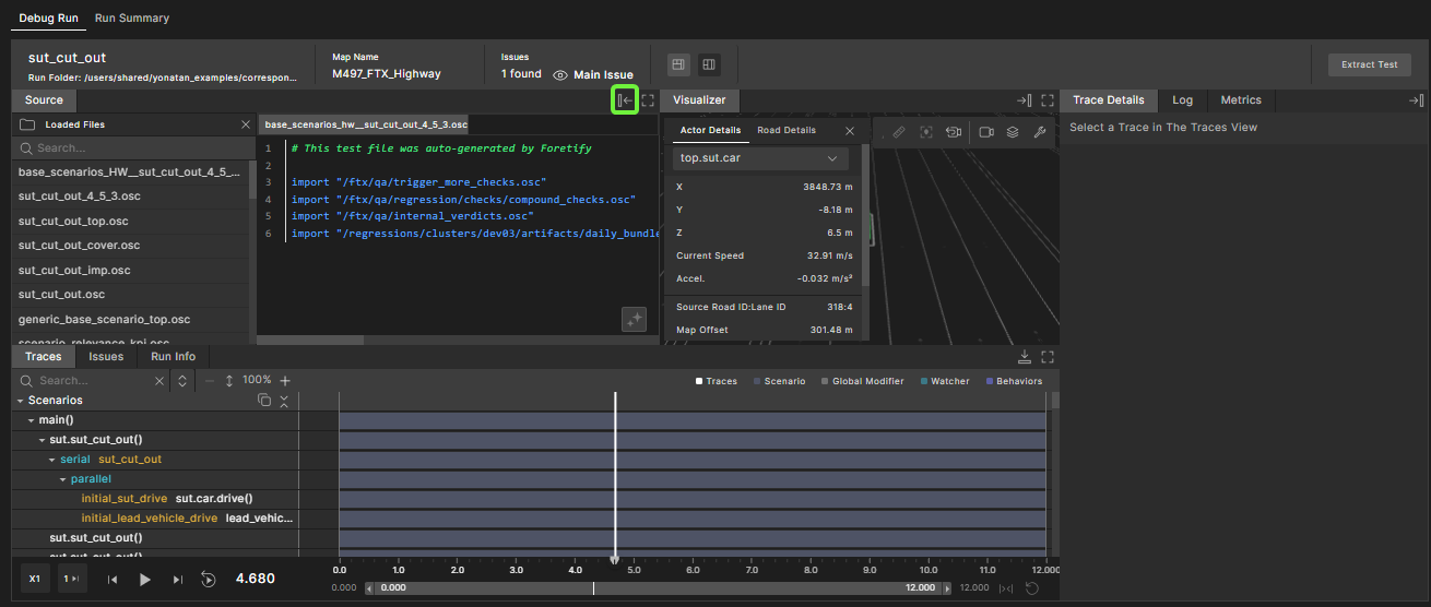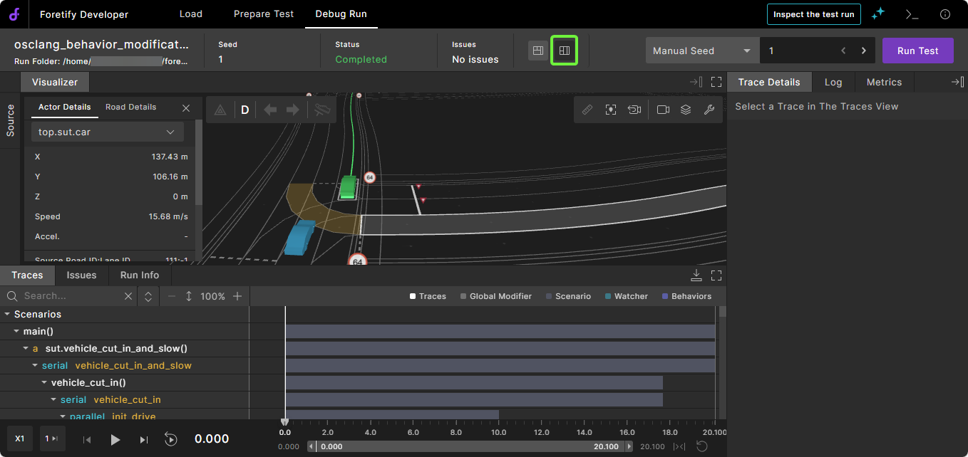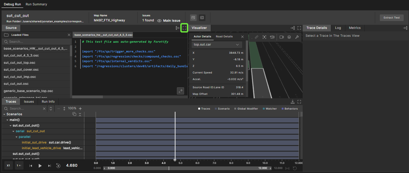 The Visualizer, Issues, and Traces frames are synchronized to the timeline displayed at the bottom of Foretify Developer. For example, if you select an issue or move the cursor in the Traces view, the other views change accordingly.