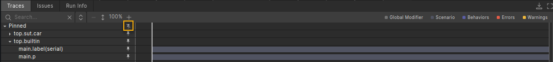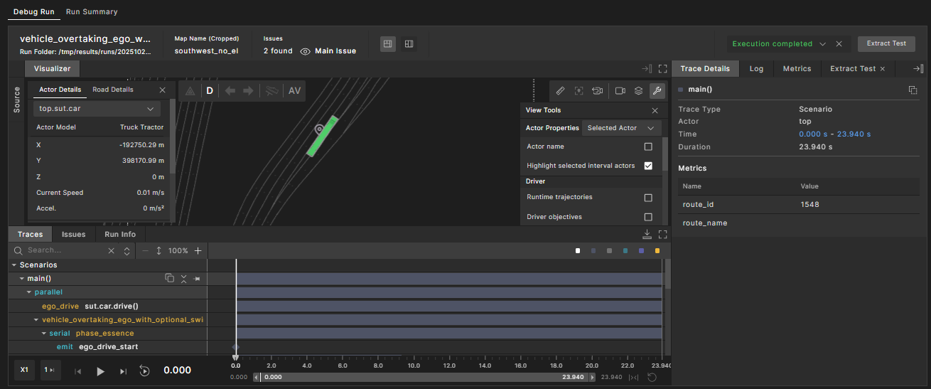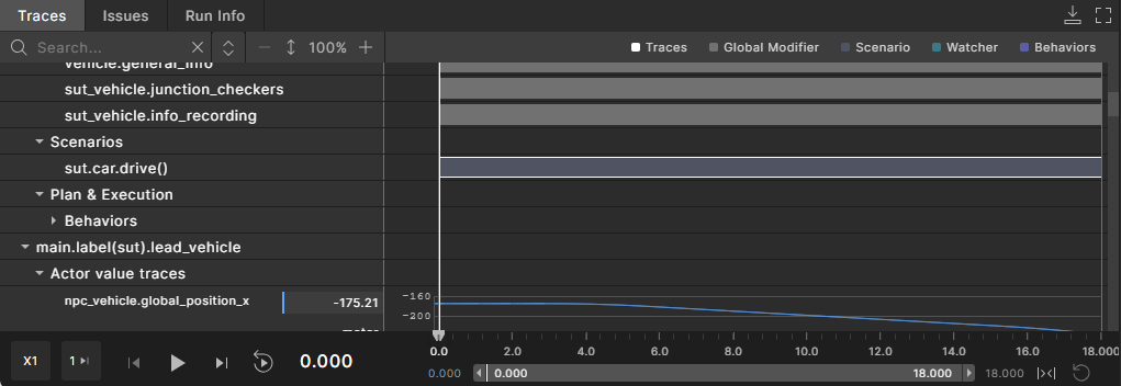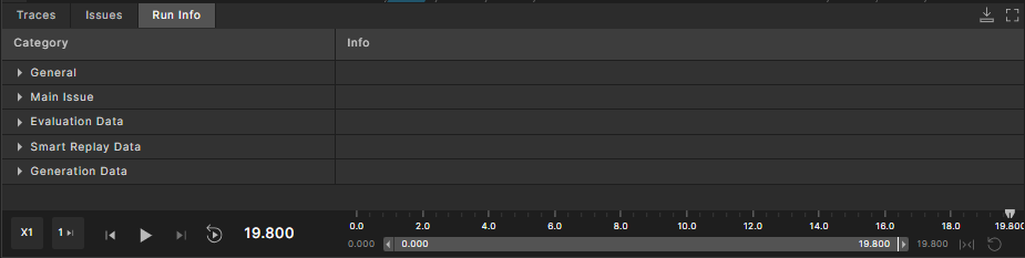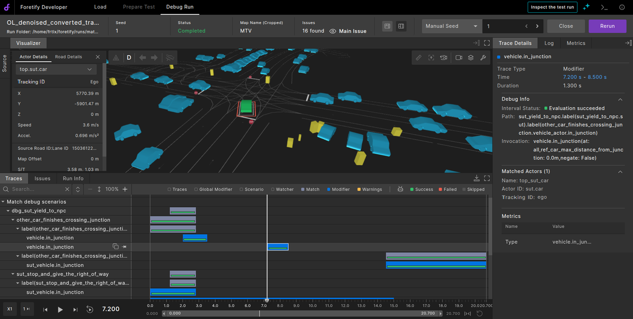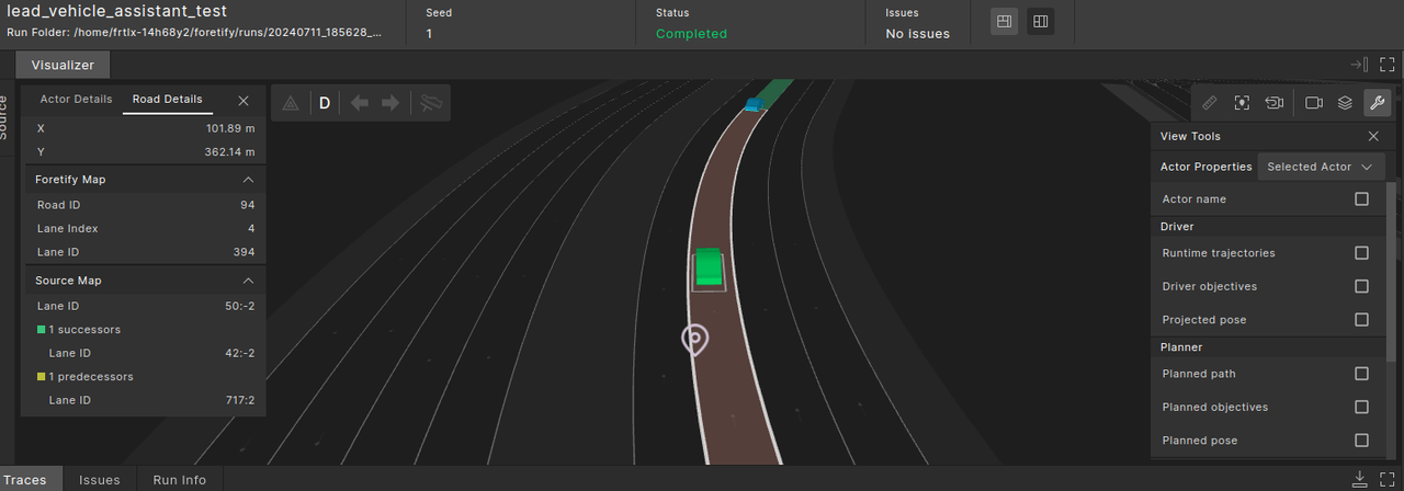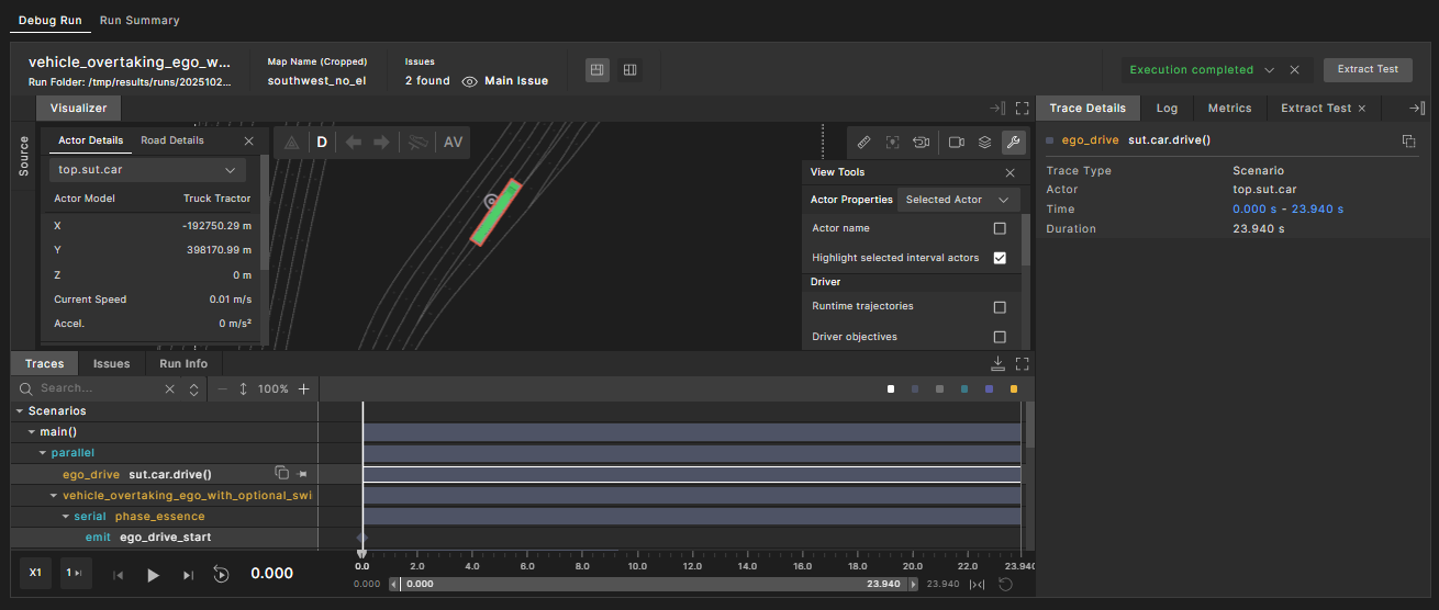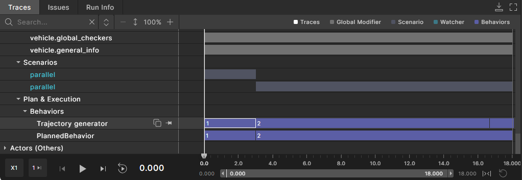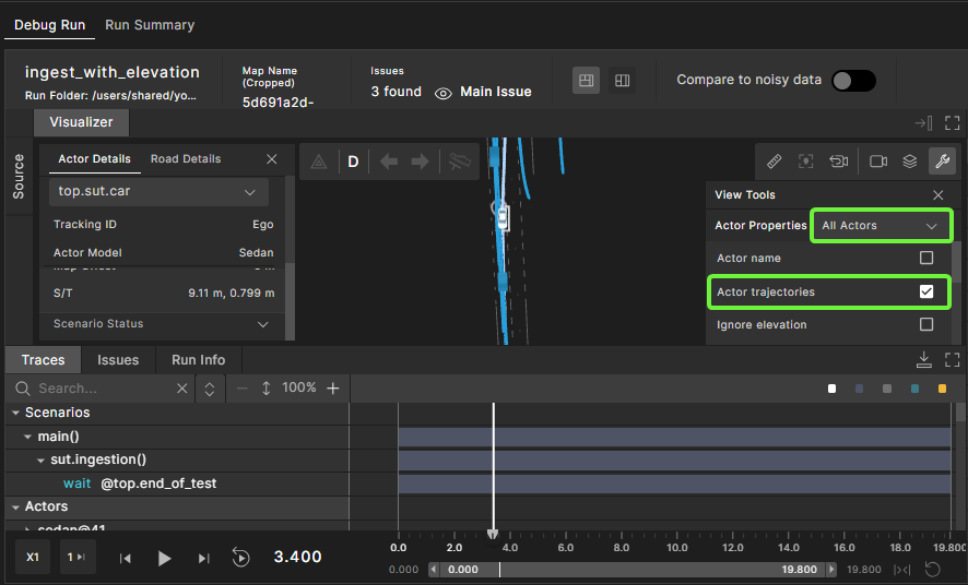 The Visualizer, Issues, and Traces frames are synchronized to the timeline displayed at the bottom of Foretify Developer. For example, if you select an issue or move the cursor in the Traces view, the other views change accordingly.