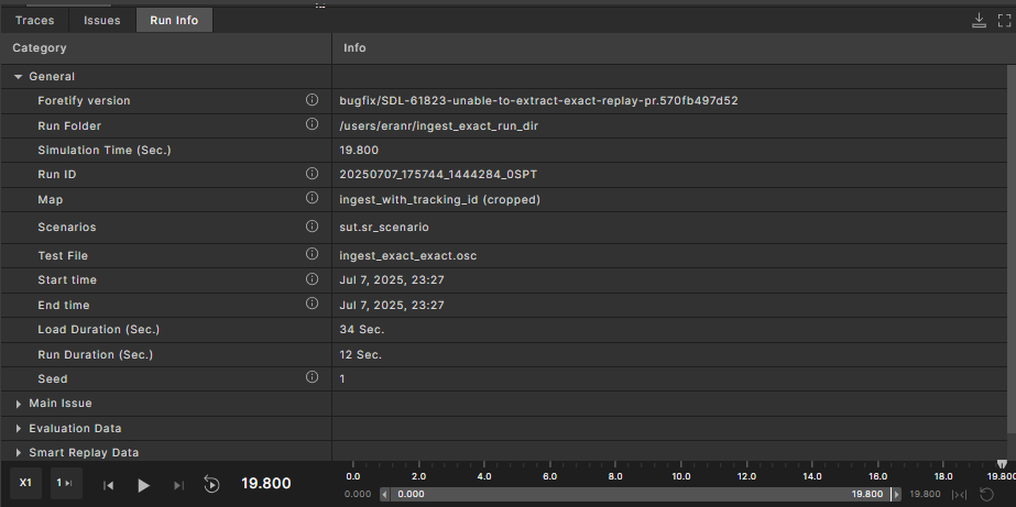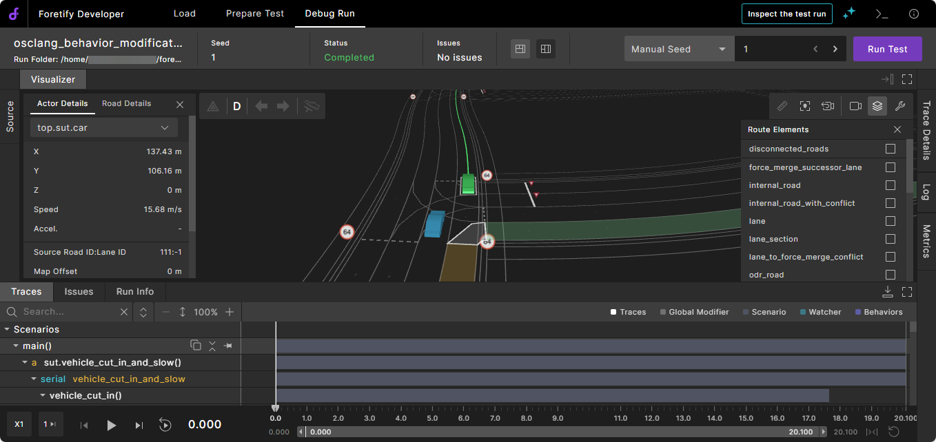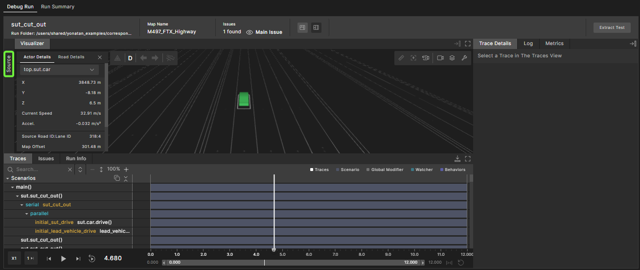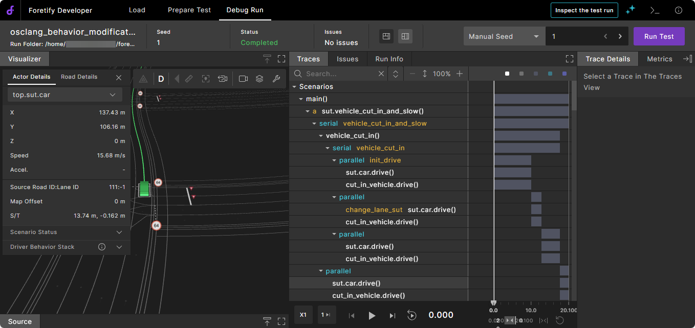 You use the single-run debugger to debug a run after you execute it in Foretify. You can also launch the single-run debugger from Foretify Manager in order to investigate runs from your test suite results.