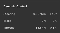 - Dynamic Control: Displays the state of the vehicle actuators if the vehicle is driven dynamically. See View Dynamic Control.