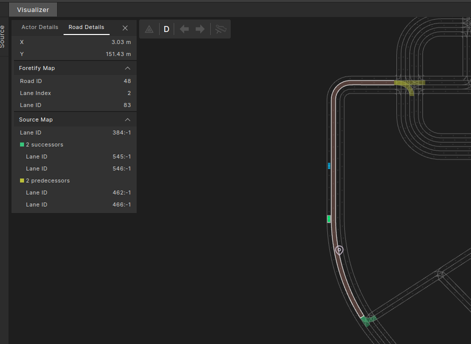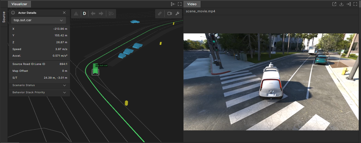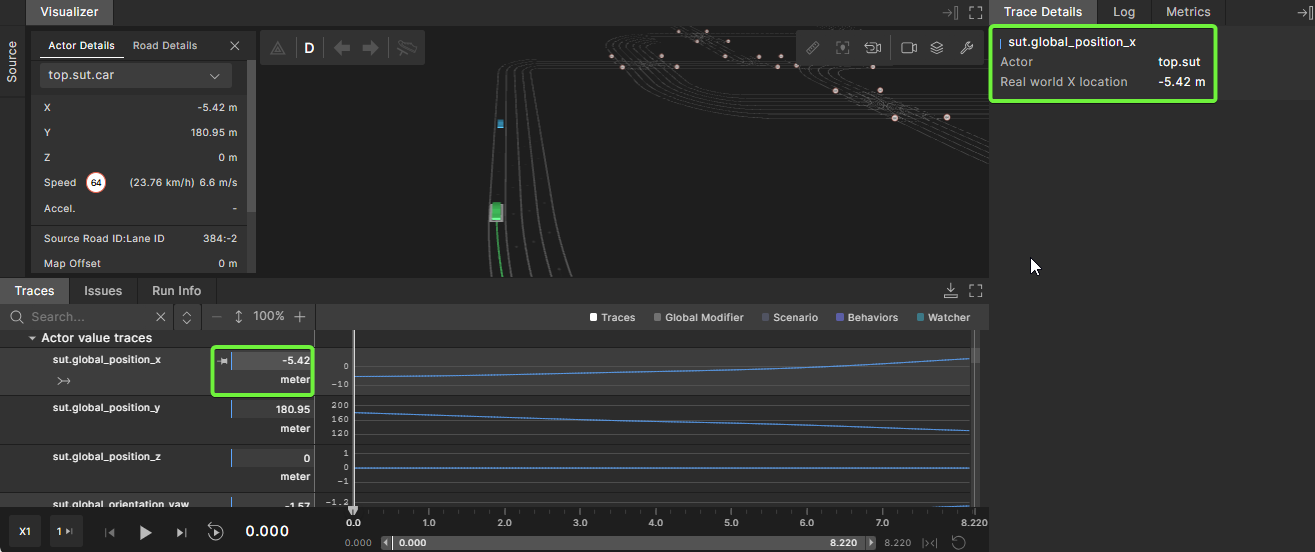 Click the Actor Details (i) icon on the top left of Visualizer and select an actor to view details of the actor, including ID, location, speed, map position, debug info, and more.