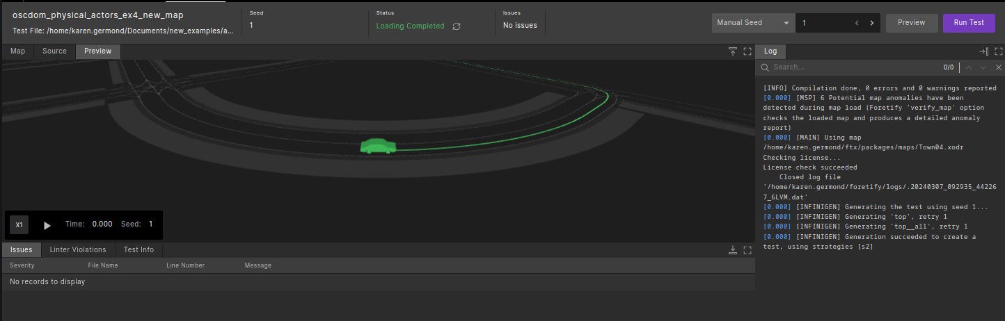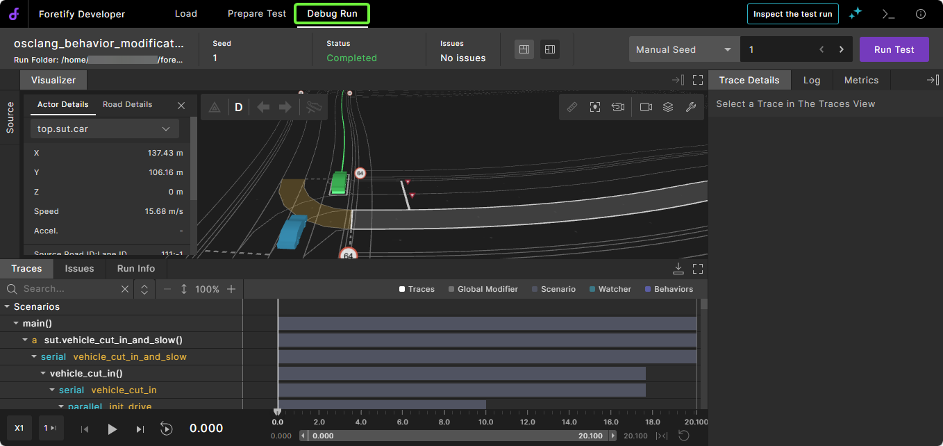Before executing a test, you can preview a run to get a sense of how the scenario will play out. You can see how the actors controlled by Foretify will behave and how the SUT will move without having to run a complete simulation.