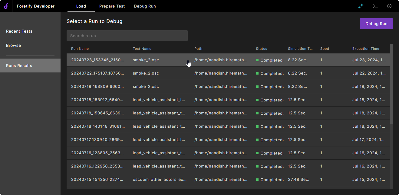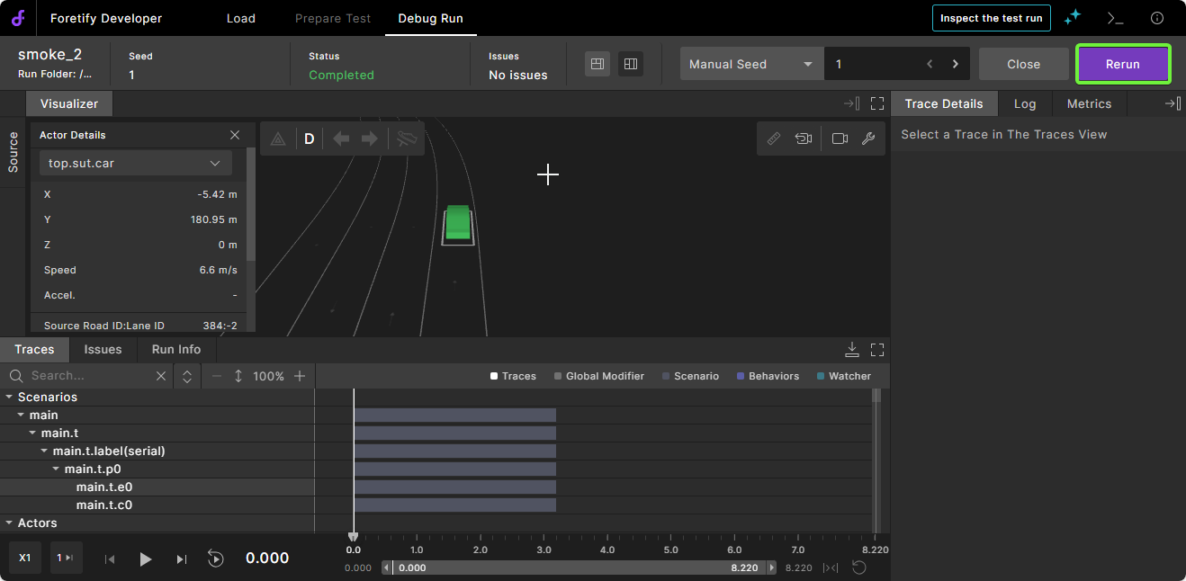 Foretify takes you to the Prepare Test tab so that you can configure the run if needed before re-executing it. For example, you can apply new traces or change the seed before rerunning.