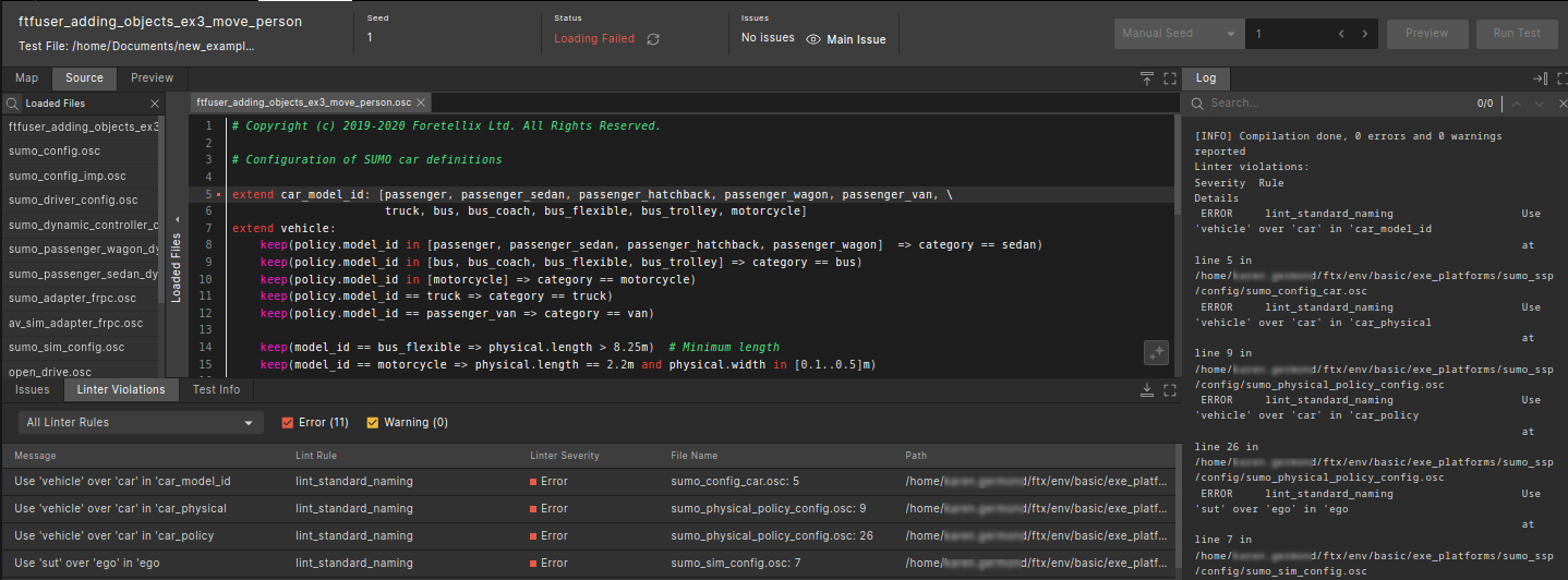 Linter violations that arise during the loading process are displayed in the Linter Violations frame at the bottom of the Prepare Test tab.