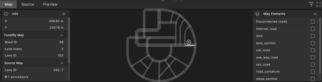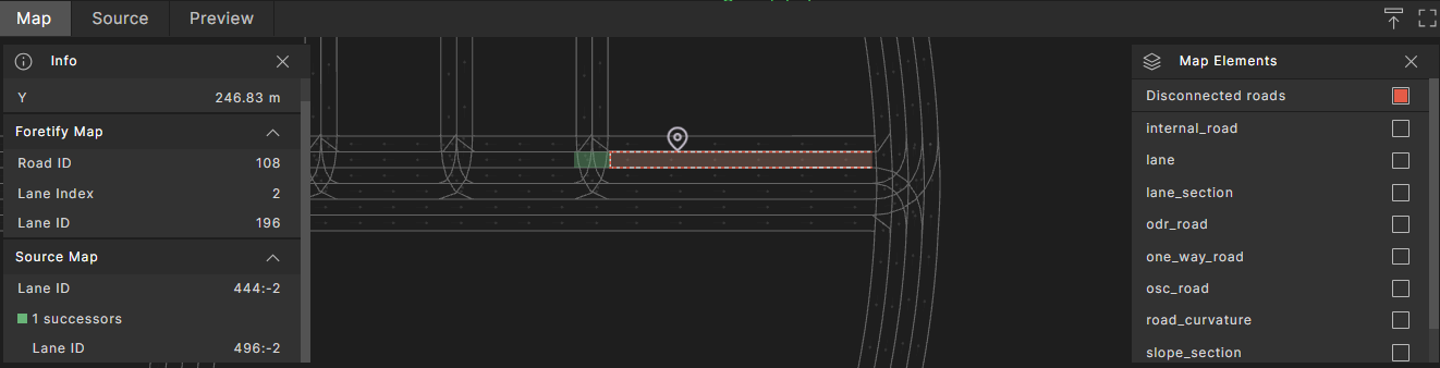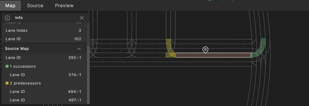 Source Map shows the road's Lane ID as well as the Lane IDs for the road's successor and predecessor roads as they are represented in the source map's format.