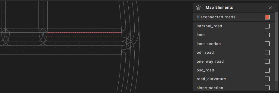 Select Disconnected roads to show lanes that do not have successor or predecessor lanes.