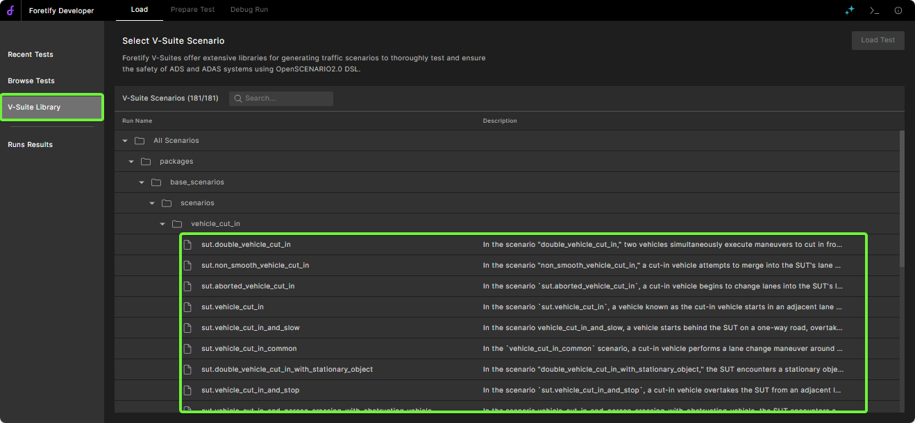 Foretify provides direct access to available V-Suite scenarios (Foretify searches for scenarios in the folder $FTX/packages) to load them easily. The provided scenarios are configured with default maps and simulators, so they can be launched as is.