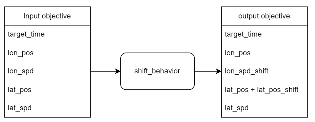 The Driver's shift_behavior allows manipulation of the input objective from the OSC2 scenario level. The manipulation is performed by applying a shift to the input objective or by setting a new absolute value. This behavior is primarily used in Smart Replay, where the Shape behavior generates objectives based on recordings. That objective is passed to the shift behavior, which allows modification of the original recordings.