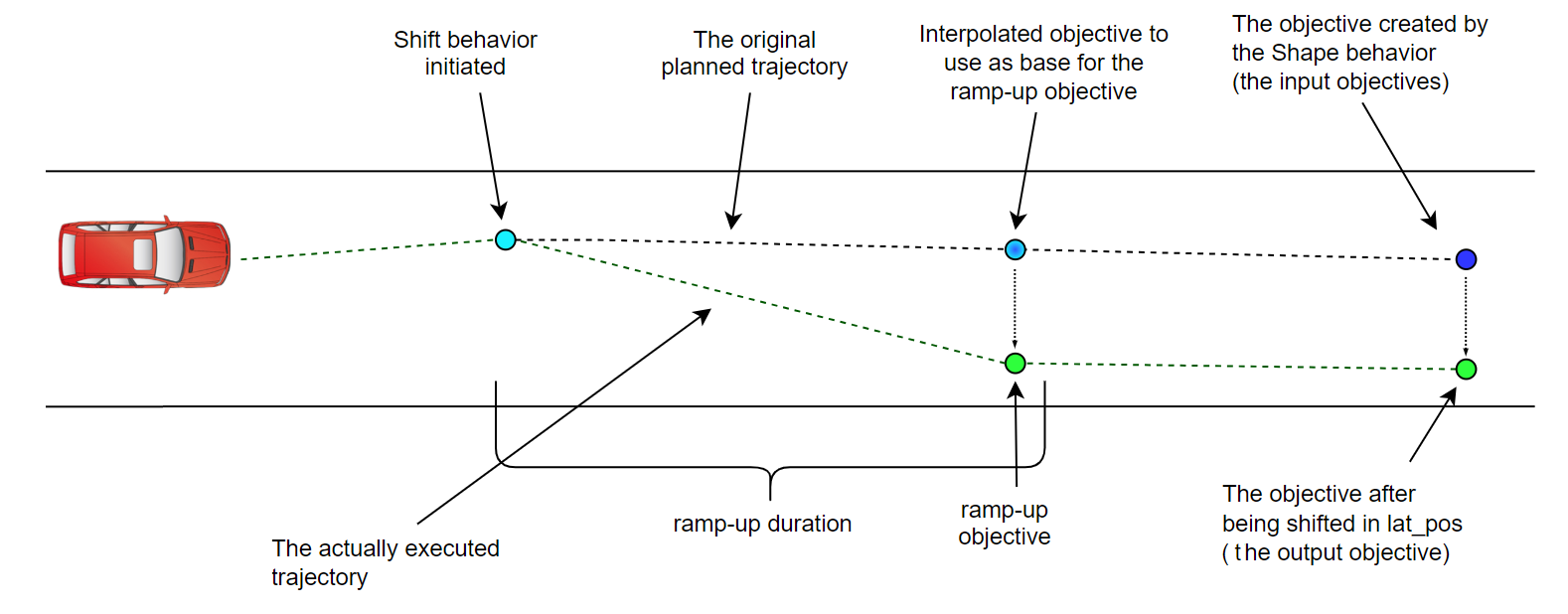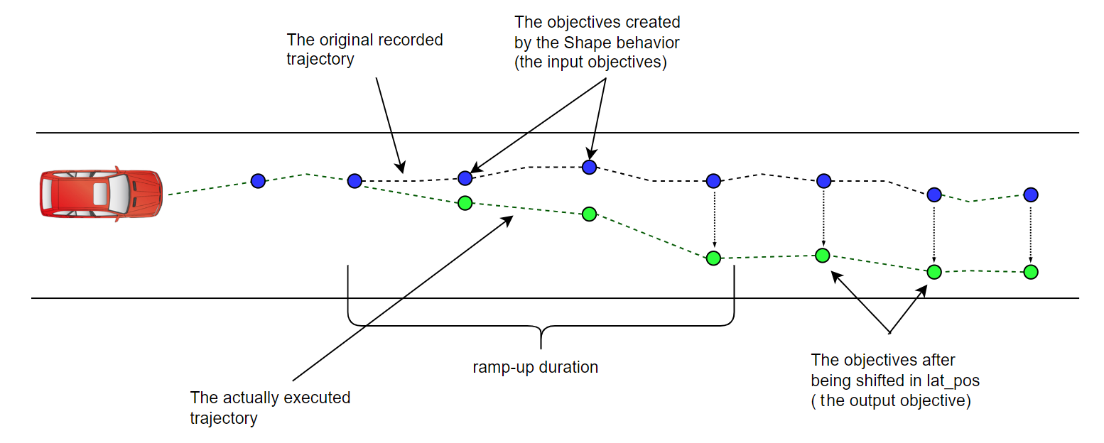 | ramp_up_duration | time | 0[s] | The duration for shift to be applied. If the provided value is zero, the shift is applied immediately on the behavioral layer. However, the trajectory generation layer will constrain the vehicle's motion to stay within the defined physical (or comfortability) boundaries. |