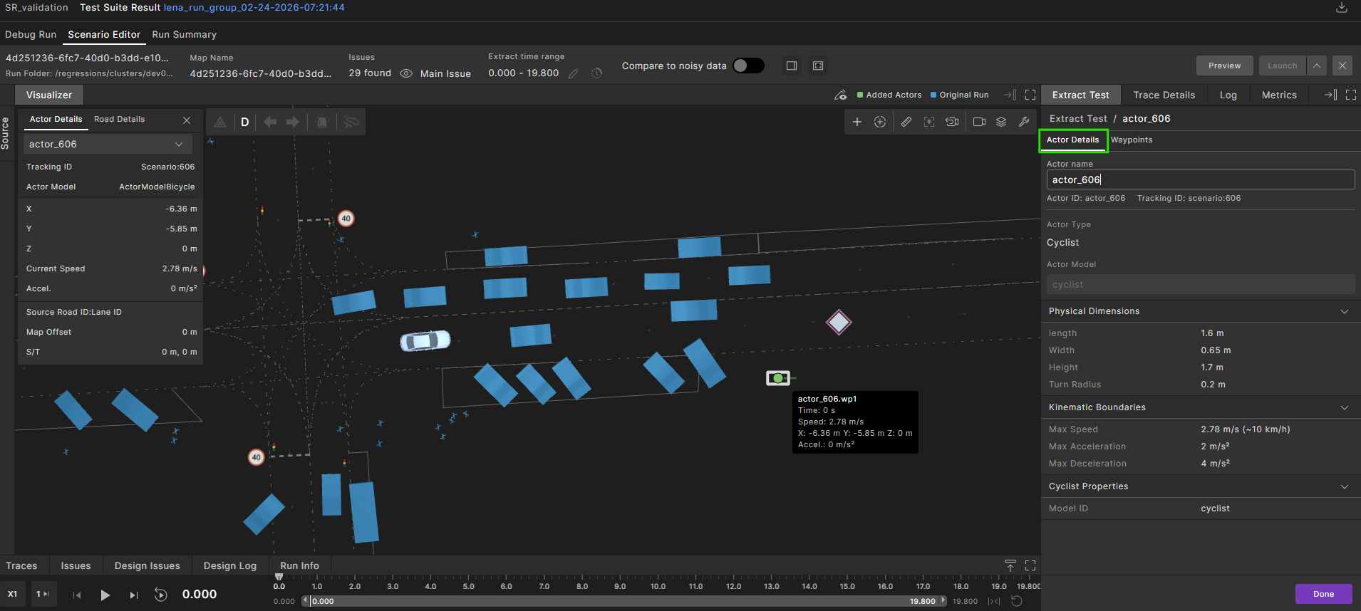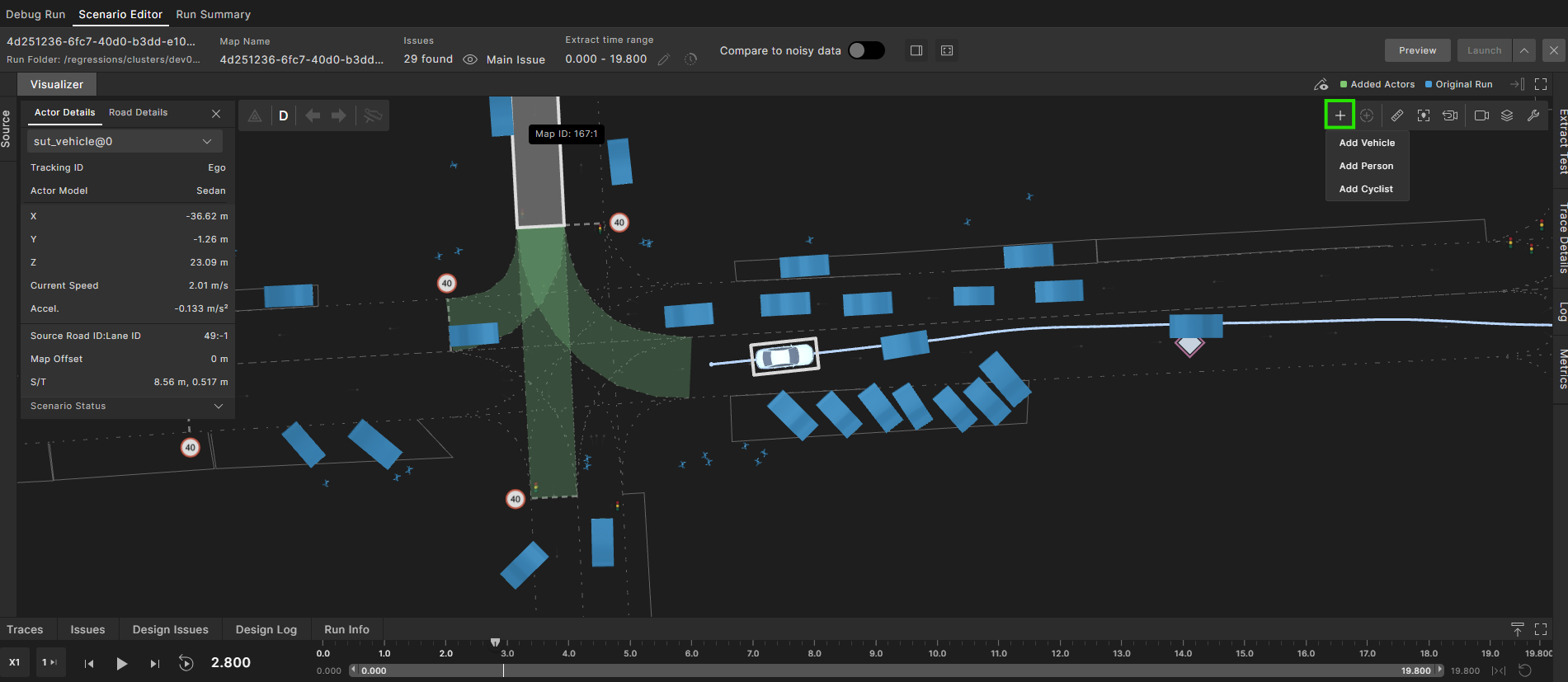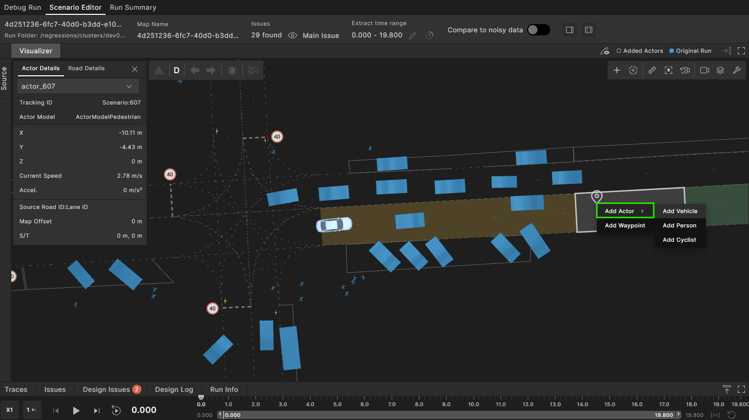 The Scenario Designer allows users to select and modify existing actors from the ingested run as well as add new synthetic actors to the scenario.