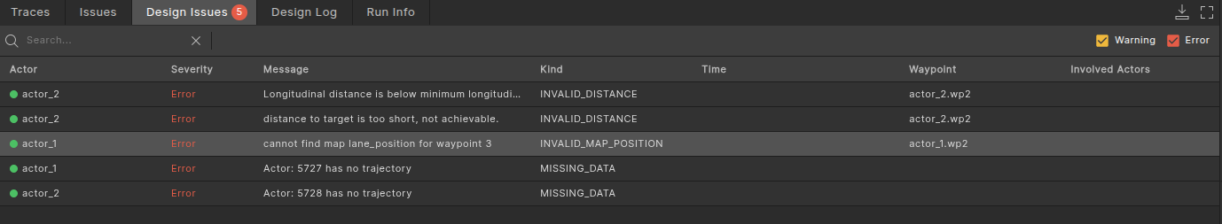 For each issue, the table shows the actor name, severity (error or warning), a detailed message, a classified issue type, and, where available, the time, waypoint details, and involved actors.