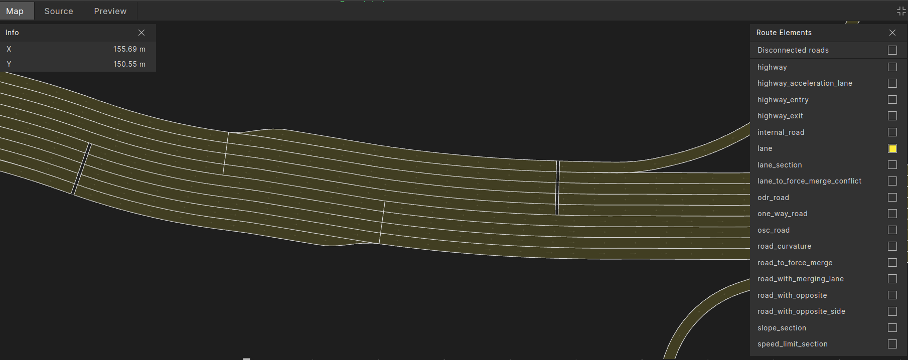 The lane route element represents a single lane within a lane_section. It can be used to specify a particular lane for a vehicle’s route and to define relationships between two different lanes, as shown in the example below. In these contexts it serves as an alternative to the vehicle.lane modifier. Additionally, it can be referenced by other route element, such as in road_with_merging_lane.