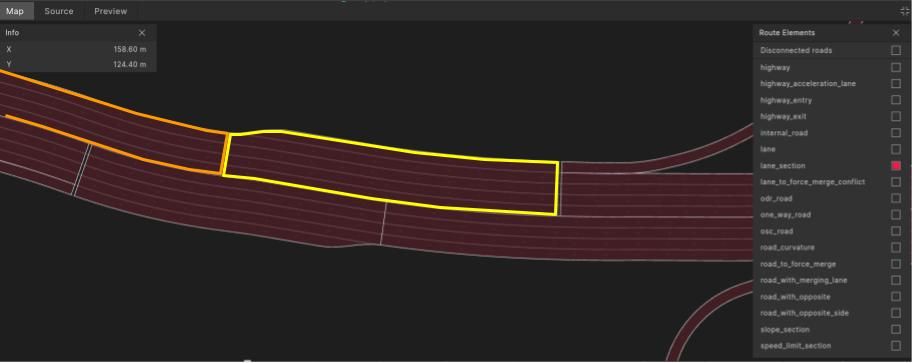 In the illustration below all lane_sections are highlighted in red. Two specific lane_section occurrences have been outlined for demonstration. The two outlined sections are on the same one_way_road. The yellow starts at the beginning of the one_way_road, then where the number of lanes decreases from five to four, the orange outlined lane_section starts.