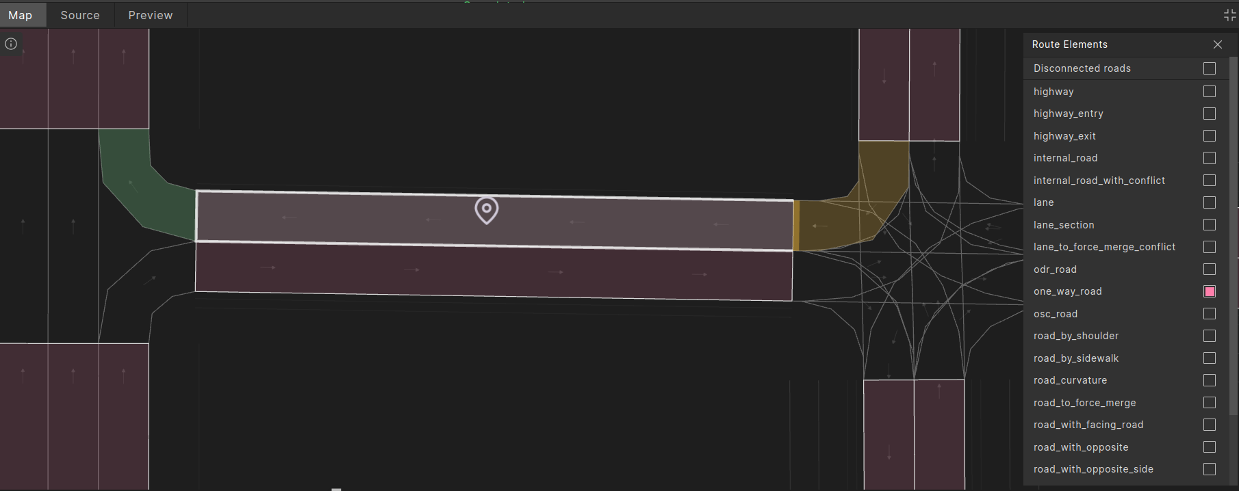 The one_way_road route element represents either a road where traffic flows in one direction or on side of a two-way road.