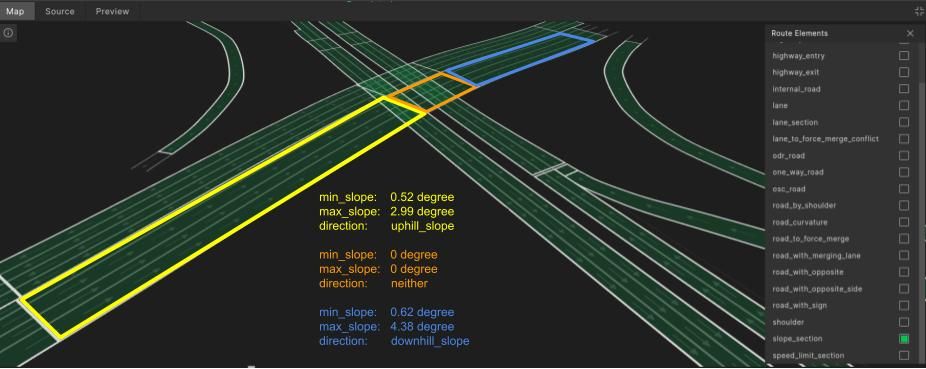 The slope_section route element represents a section of the one_way_road on which the pitch-slope angle does not change by more than map_config.maximal_longitudinal_slope_change, defaulting to five degrees, and the direction of the slope remains the same.
