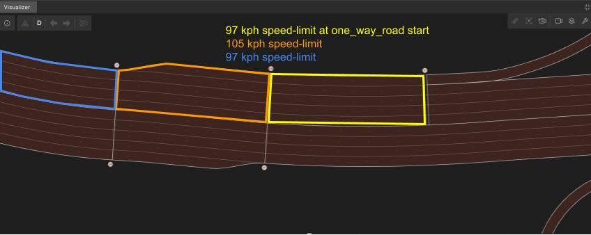 - The yellow outlined occurrence at the beginning of a `one_way_road` with a speed limit of 97 kph.