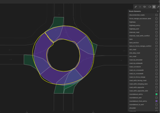 The image below highlights the roundabout_from_entry elements of a single roundabout. Since they overlap, a single instance is outlined in yellow for illustration.