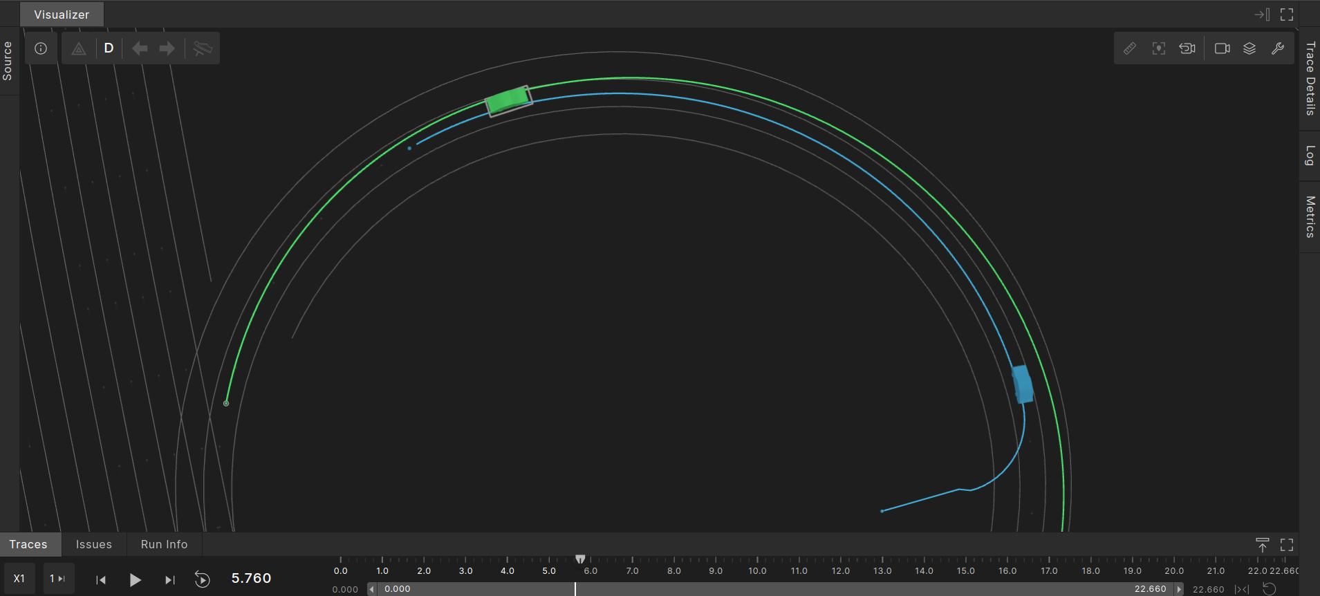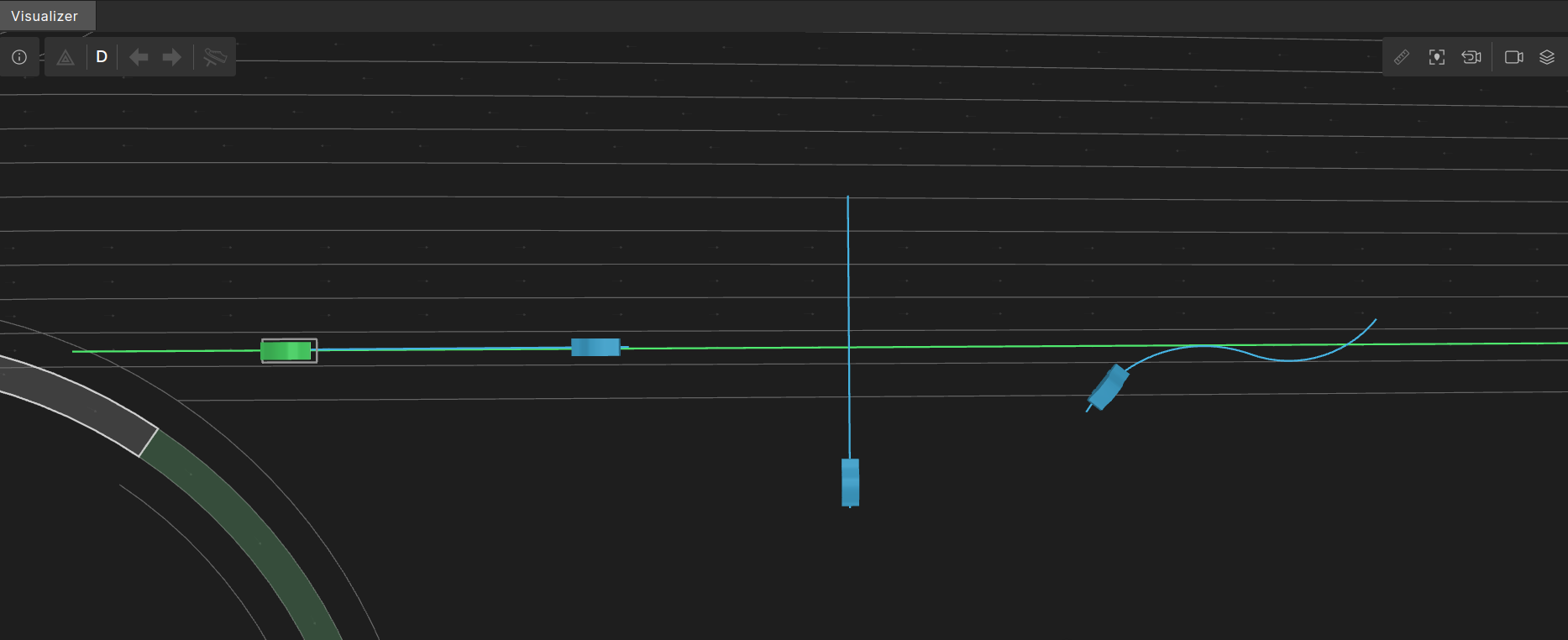 The image below shows the planned path of one random execution. The SUT’s planned path is marked in green and the NPC’s planned path is marked in blue.