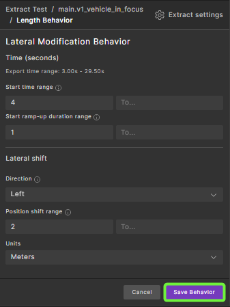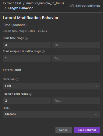 Parameter Description Start time range Defines when the lateral shift should begin. Use the Fromfield for a specific start time. To introduce variability, specify bothFromandToto create a time window.Start ramp-up duration range Indicates the desired duration for the lateral shift transition. A smaller value results in a quicker shift, while a larger value produces a more gradual movement. Direction Specifies the direction of the lateral shift, typically either Left or Right. Position shift range Determines how far the actor should shift laterally. Use the Fromfield for a fixed shift amount, or provide bothFromandToto define a range of possible shifts.Units Specifies the measurement units for the shift distance (e.g., meters, feet). For example, suppose a speed modifier is predefined with a speed target range of [4..6] that starts at 3 seconds. To terminate this modifier at 7 seconds, you can define another speed modifier by selecting Restore default speed and specifying the Start time range to stop the previously defined modifier.