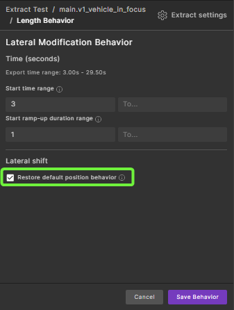 Parameter Description Start time range Specifies when the actor lateral shift modification must begin transitioning back to its original values. This time is relative to the original scenario run. Start ramp-up duration range Defines how long (in seconds) the actor should take to return to its original values. Shorter durations result in a faster reset, while longer durations allow for a smoother transition. -