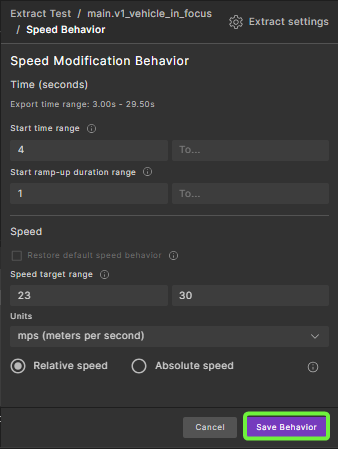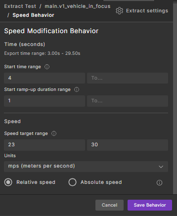 Parameter Description Start time range Defines when the modification begins. Specify a single value in the Fromfield to start at an exact time. To allow flexibility, use bothFromandToto define a time range.Start ramp-up duration range Indicates the preferred duration over which the speed change should occur. A shorter duration results in a quicker transition, while a longer duration leads to a smoother, more gradual change. Speed target range Defines the target speed for the actor. Use the Fromfield alone for a fixed speed, or use bothFromandToto define a range.Units Specifies the units used for speed (e.g., m/s, km/h). Relative or Absolute Determines whether the speed modification is relative to the current speed or an absolute value. When set to Relative, negative values can be used to reduce speed. -